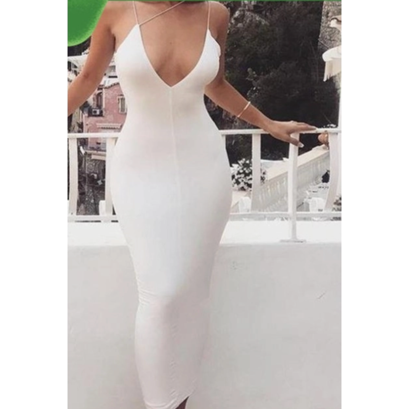 Available in two colors.Velvety. long. elegant. and flirty. This dress does a beautiful job of accentuating the wearer’s features; from the slim cut to the thin strap to the low cut neckline. this dress is very flattering and sultry while still managing to look classy and elegant. Easy to wear and easy to look put together. A staple piece for a night on the town. Tight fitting. Runs true to size.