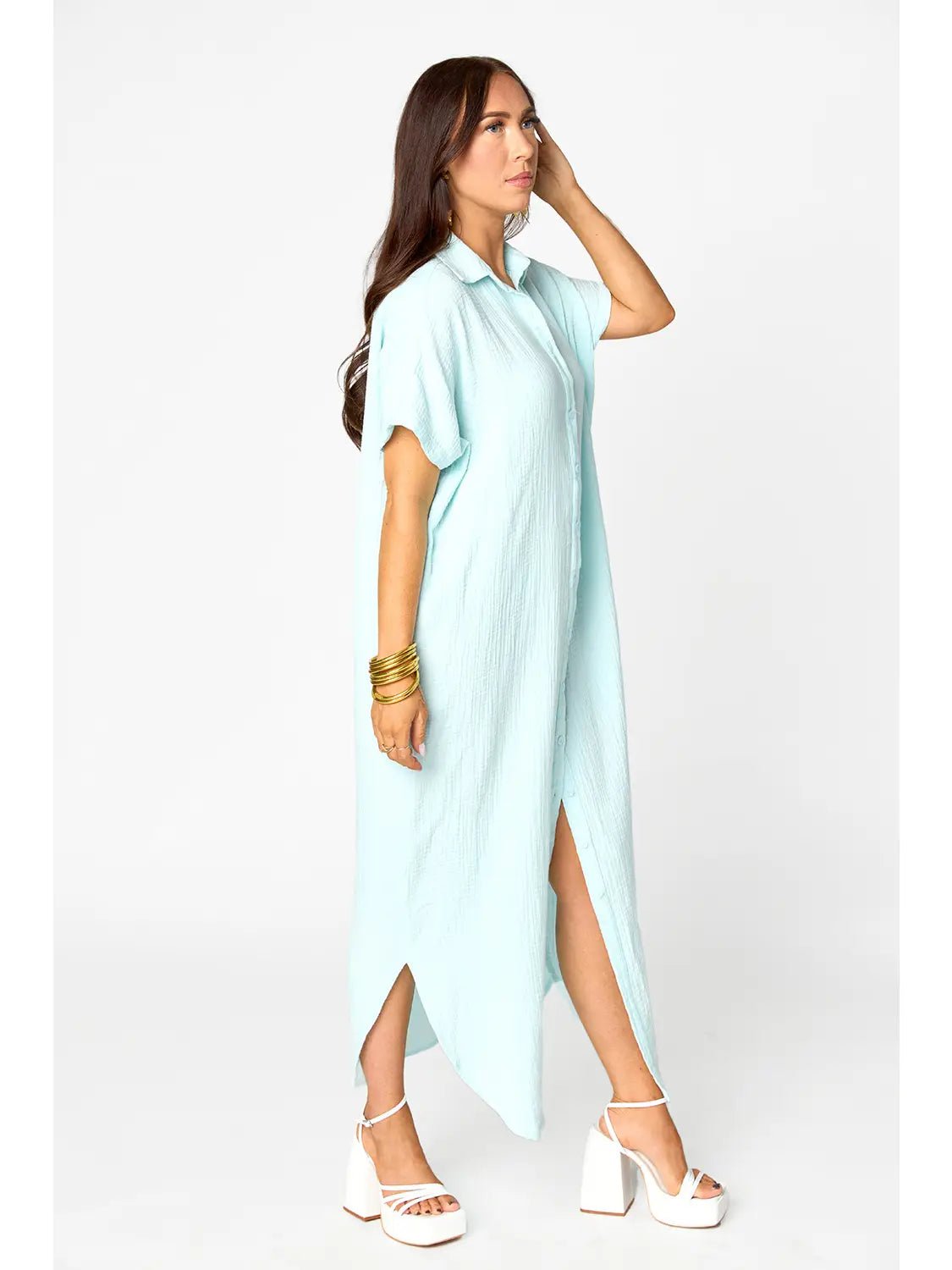 Look comfy and cute at the beach in this Carmen Cover Up Maxi Dress! Crafted in lightweight gauze. it features short sleeve and buttons running all down the frontFit:
