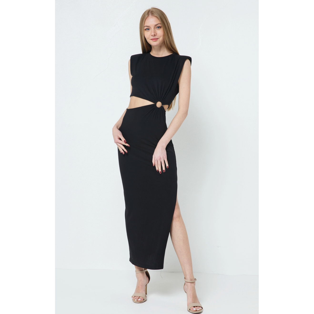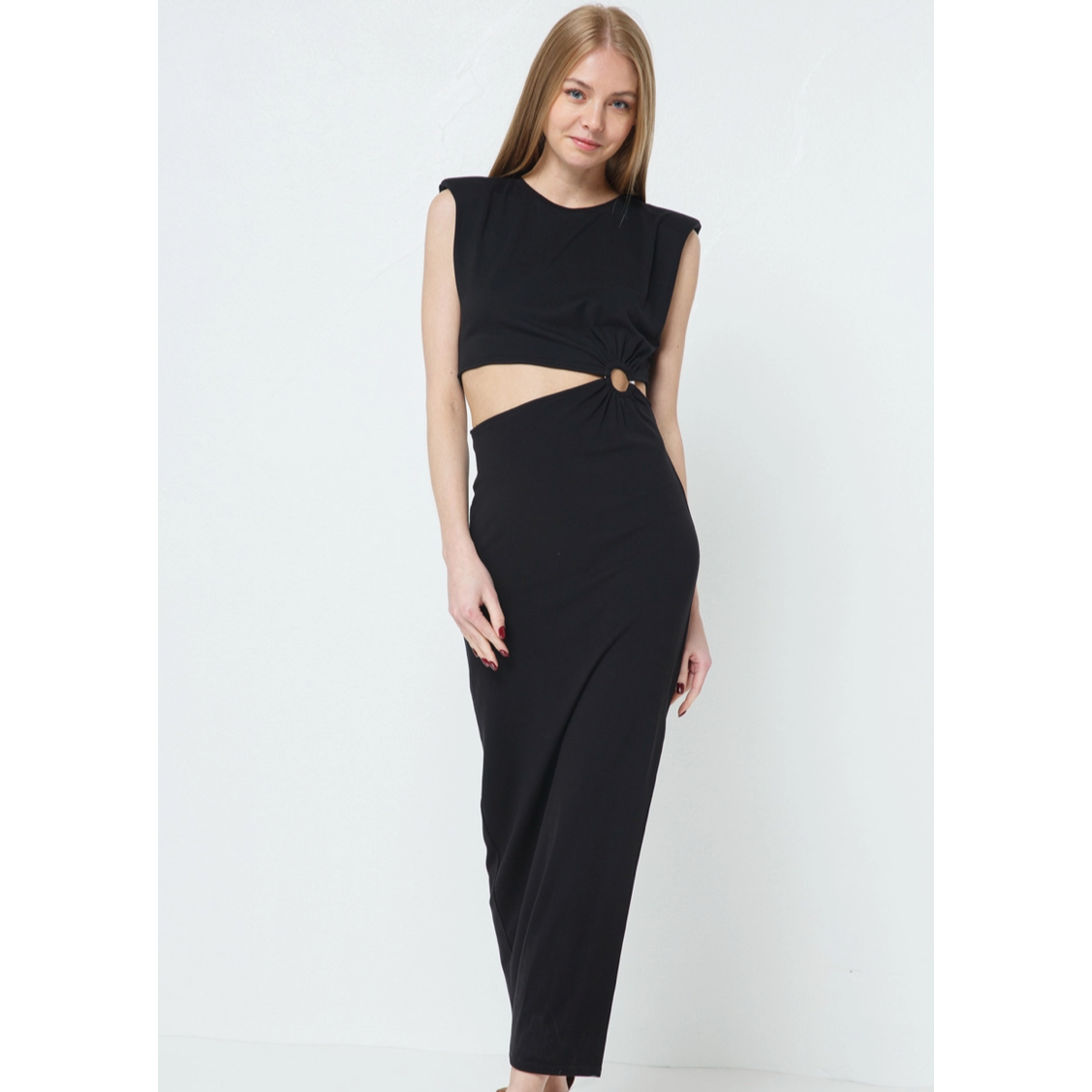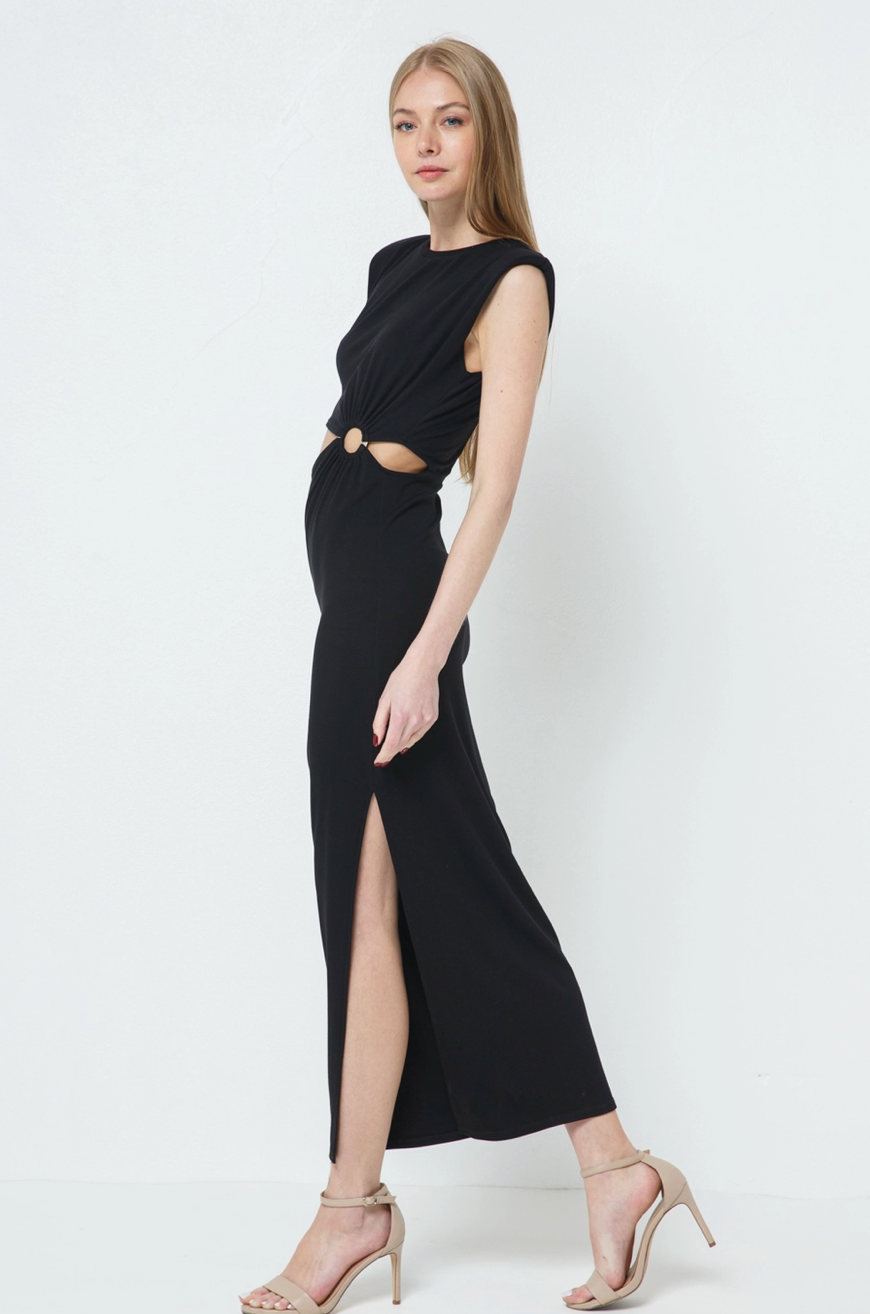 Sexy black maxi with thigh slit and cut out o-ring at waist. Be ready to dance all night in this killer dress! Available in two colors. Runs true to size. Model is wearing size small.