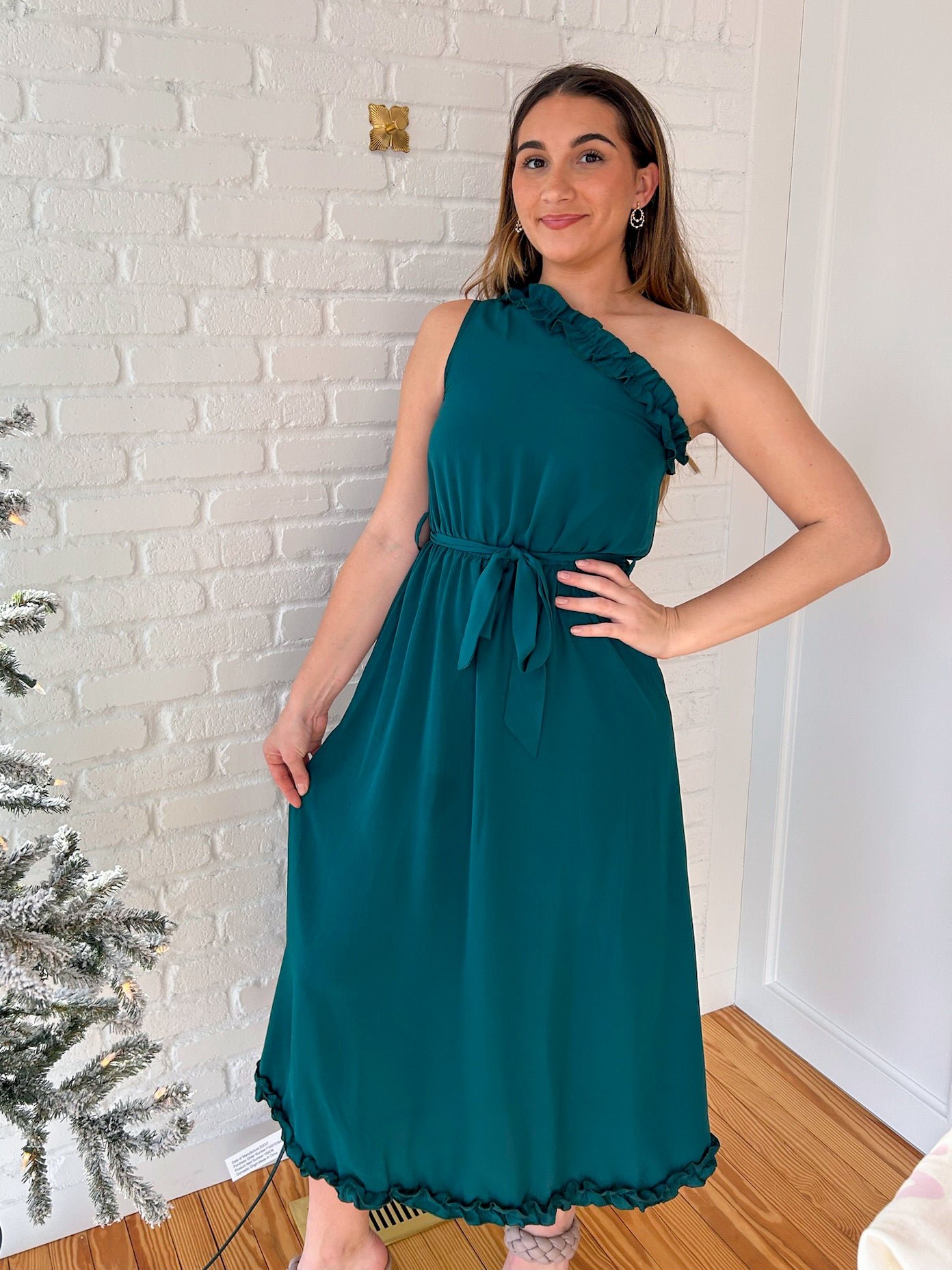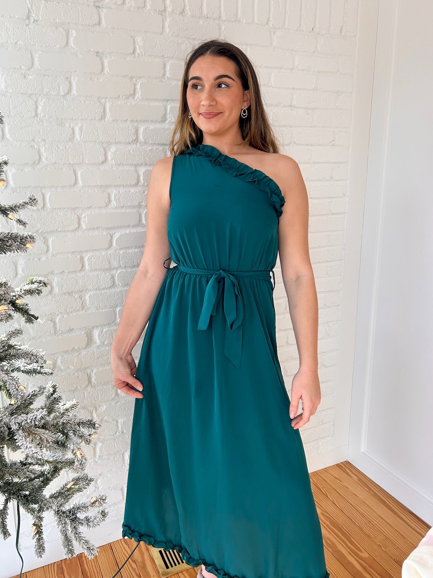 Lovely Endings One-Shoulder Ruffled Maxi Dress. Available in red. black. navy and green. This lightweight woven maxi dress boasts a ruffle-trimmed one-shoulder neckline and sleeveless bodice with a removable sash tie. A flared maxi skirt that ends with a ruffled hem. Fits true to size.Model is wearing size small. Fabric is polyester cotton blend.