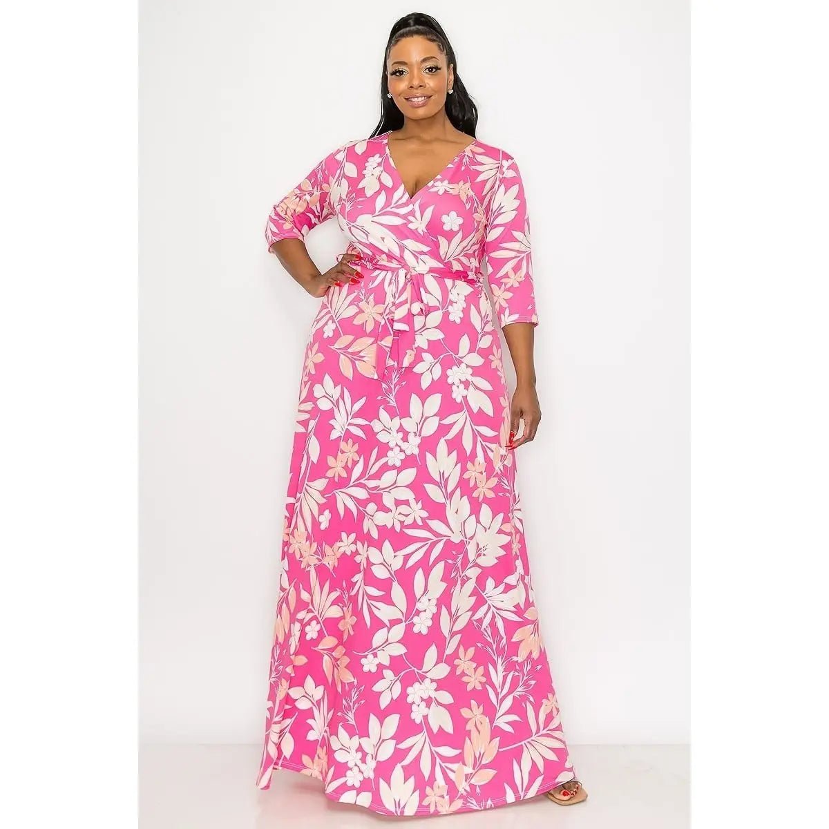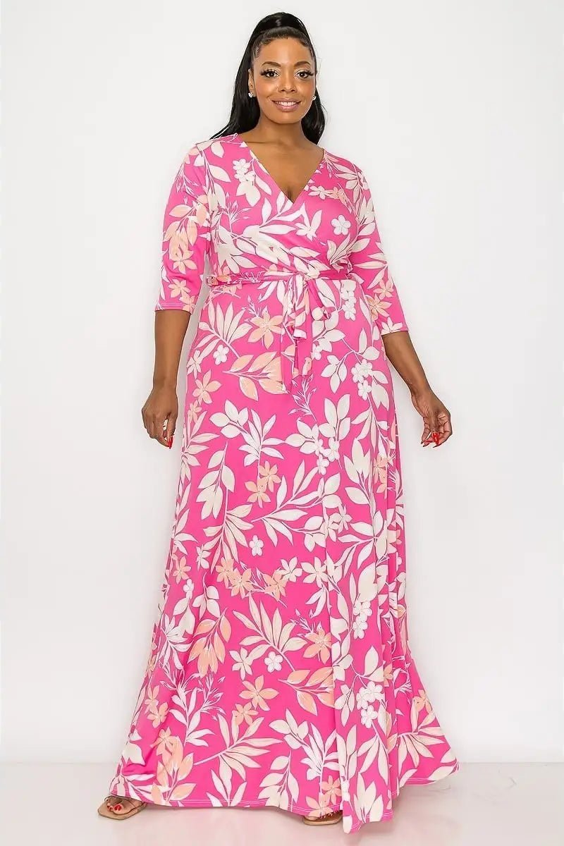 Curvy fit pink tropical floral maxi a-line dress. Self tie belt. 95% poly 5% spandex
