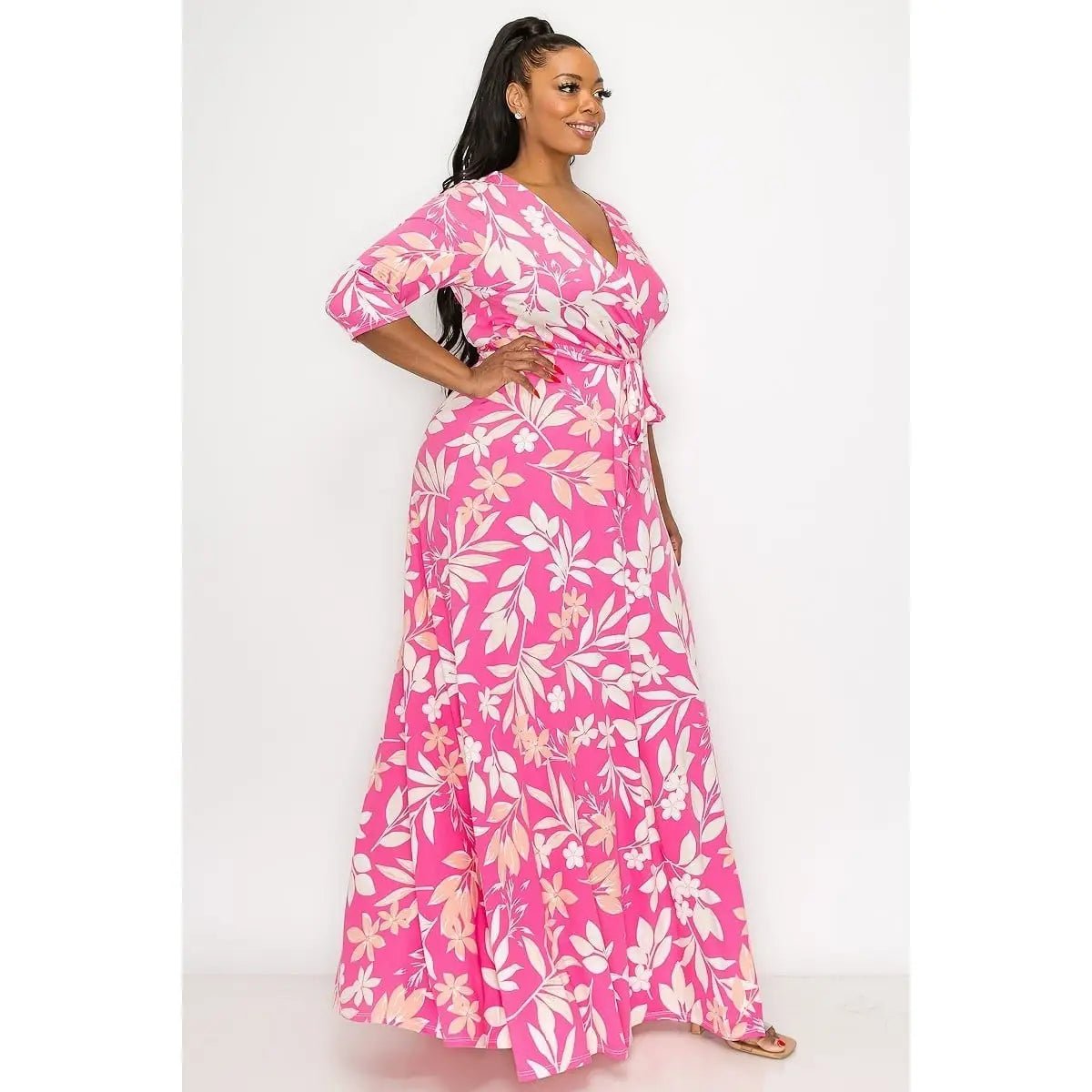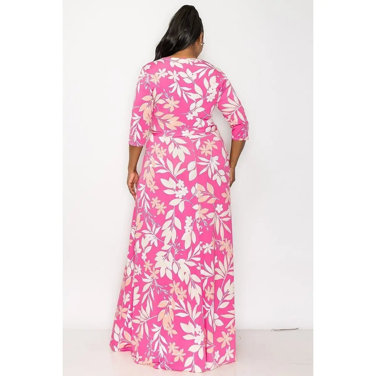 Pink Palms V Neck Curvy Fit Maxi Dress