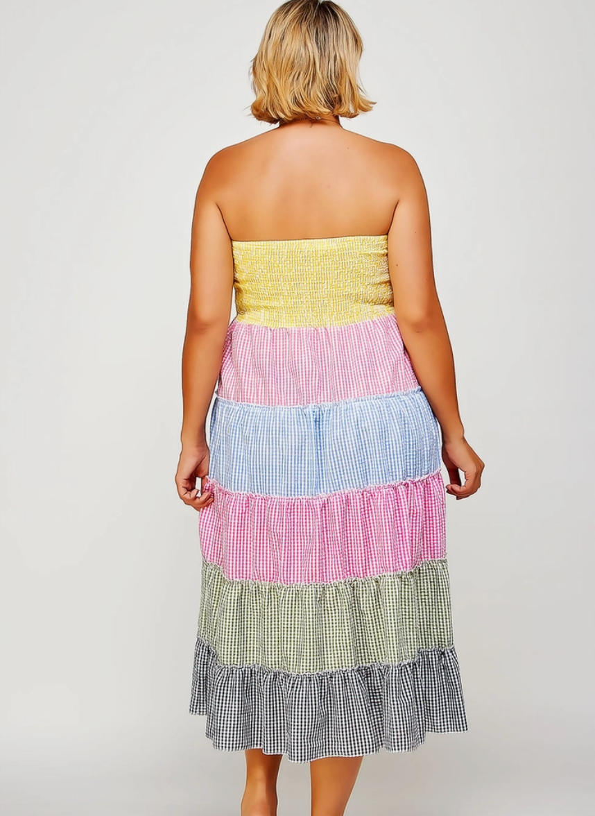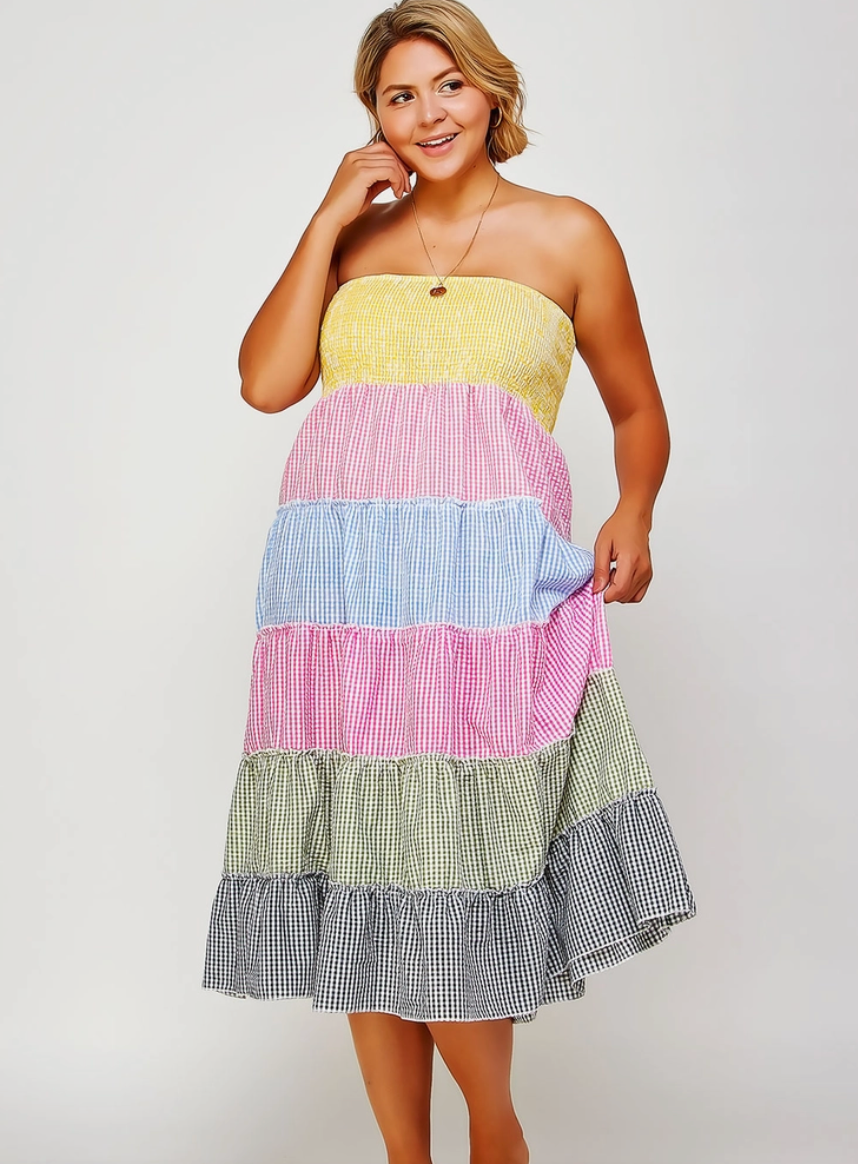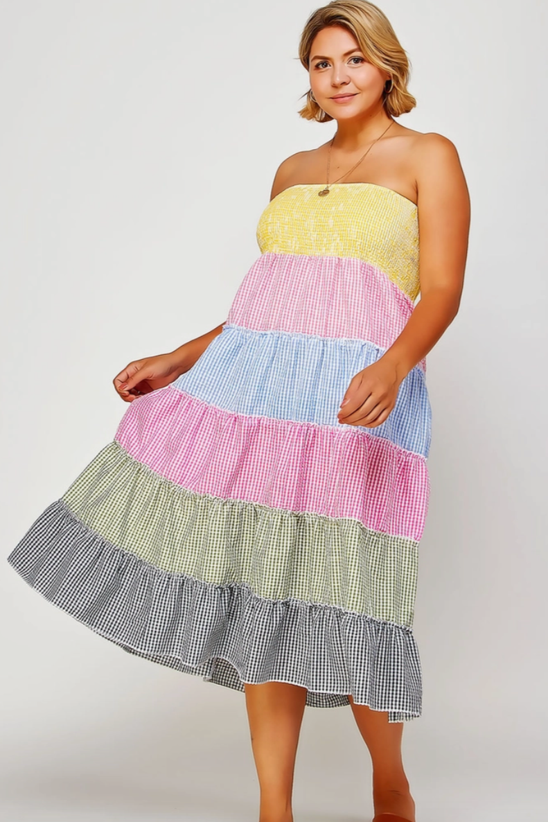 Tiered Smocked Gingham Convertible Curvy Fit Skirt Dress