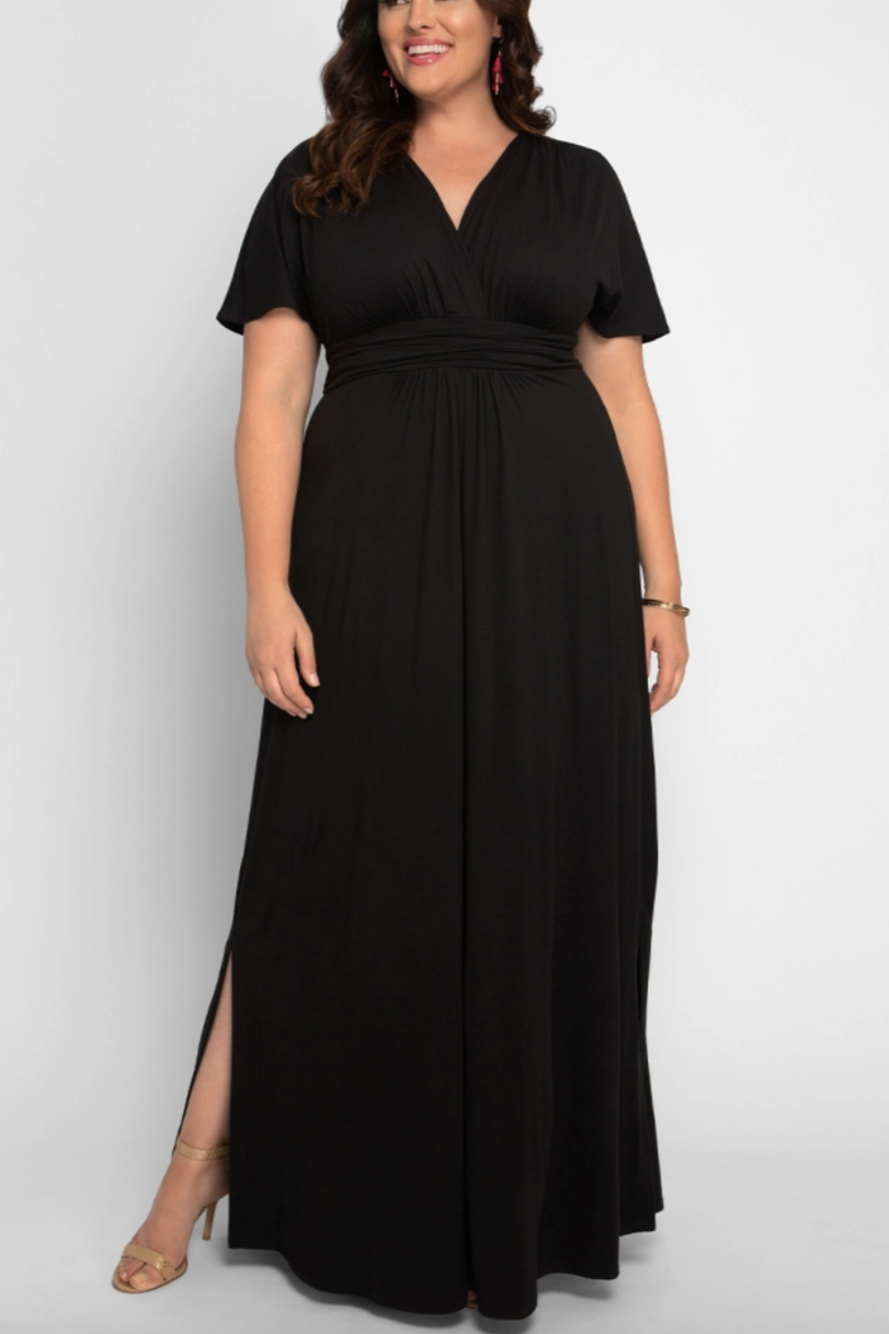 Not your typical maxi dress. our curvy fit Vienna Maxi Dress steals the spotlight with sexy slits for a dramatic flair. A sexy and comfortable bodice looks elegant and lovely on everyone. Dolman sleeves. an empire waist. and a deep yet narrow V-neck are extremely flattering.